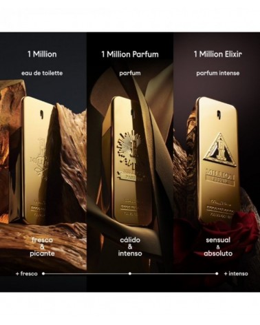 Descubre 1 Million Elixir,la cúspide de la intensidad de Million, una nueva fragancia guiada por el deseo de la calidad suprema. Una mezcla de ingredientes cuidadosamente seleccionados de todo el mundo, que celebra la artesanía de nuestros perfumistas y la fusión de las mejores materias primas. Una nueva dimensión, increíblemente intensa, inconfudiblemente 1 Million. El icónico lingote de oro de 1 Million, más audaz y sofisticado que nunca. Una joya artesanal que refleja las diferentes facetas de la fragancia. El signo de una nueva fuerza: elegante, intensa y enigmática. La botella de preciosa elaboración encapsula el alma y la esencia de 1 Million, la profundidad infinita de esta nueva creación olfativa. La cumbre de la intensidad absoluta. 1 Million Elixir, más intensa que nunca para cautivar tus sensaciones. Los ingredientes seleccionados a mano, rosa de Damasco turca, osmanthus y haba tonka de cultivo silvestre, sin duda hacen que esta obra maestra destaque por la extrema calidad de sus materias primas. La Davana, profundamente sensual y licorosa vibra con el poder de las suaves maderas y las semillas de vainilla negra. la sensualidad suprema se encuentra con un poder absoluto de larga duración. Familia Olfativa: Oriental Amaderado. Notas de salida: Davana, Manzana. Notas de corazón: Rosa de Damasco, Osmanthus, Madera de Cedro Ahumada. Notas de fondo: Vainilla absoluta, Haba Tonka, Pachulí.