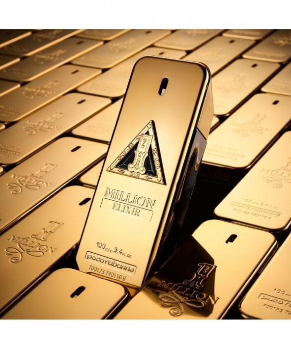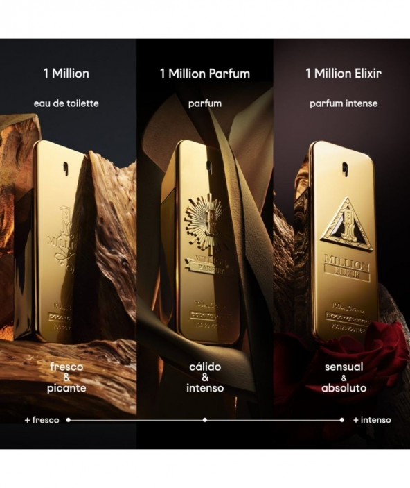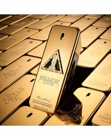 Descubre 1 Million Elixir,la cúspide de la intensidad de Million, una nueva fragancia guiada por el deseo de la calidad suprema. Una mezcla de ingredientes cuidadosamente seleccionados de todo el mundo, que celebra la artesanía de nuestros perfumistas y la fusión de las mejores materias primas. Una nueva dimensión, increíblemente intensa, inconfudiblemente 1 Million. El icónico lingote de oro de 1 Million, más audaz y sofisticado que nunca. Una joya artesanal que refleja las diferentes facetas de la fragancia. El signo de una nueva fuerza: elegante, intensa y enigmática. La botella de preciosa elaboración encapsula el alma y la esencia de 1 Million, la profundidad infinita de esta nueva creación olfativa. La cumbre de la intensidad absoluta. 1 Million Elixir, más intensa que nunca para cautivar tus sensaciones. Los ingredientes seleccionados a mano, rosa de Damasco turca, osmanthus y haba tonka de cultivo silvestre, sin duda hacen que esta obra maestra destaque por la extrema calidad de sus materias primas. La Davana, profundamente sensual y licorosa vibra con el poder de las suaves maderas y las semillas de vainilla negra. la sensualidad suprema se encuentra con un poder absoluto de larga duración. Familia Olfativa: Oriental Amaderado. Notas de salida: Davana, Manzana. Notas de corazón: Rosa de Damasco, Osmanthus, Madera de Cedro Ahumada. Notas de fondo: Vainilla absoluta, Haba Tonka, Pachulí.