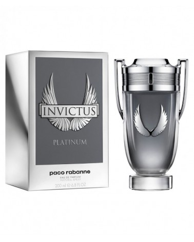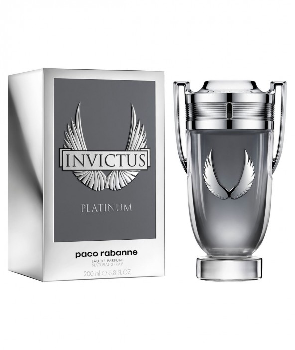 De la familia Invictus de Paco Rabanne, llega la fragancia Invictus platinum, un eau de parfum para todos aquellos que no les da miedo enfrentarse a todo tipo de retos. Ha llegado el momento de dejarse abrazar por el triunfo del esfuerzo. Un perfume que fusiona la menta, la lavanda y el ciprés para generar una fragancia electrizante. El frasco vuelve a plasmar las icónicas alas de invictus, pero en esta ocasión con un brillante acabado en relieve sobre el frasco de platino. Un perfume único que auna el poder de la fresca menta, con el vigoroso pomelo y el ajenjo, junto con notas de pachulí y ciprés, aportando un acabado amaderado que da fuerza y personalidad. El perfume Invictus Platinum está disponible en los formatos de 50ml, 100ml y 200ml.