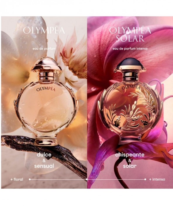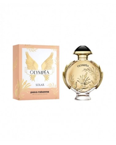 La belleza en su zenit. Olympéa Solar, la nueva Eau de Parfum Intense de Paco Rabanne. La fragancia de una Diosa amazona. Fuerte e independiente, Olympéa brilla con una energía solar. Una verdadera belleza en su zenit, majestuosa y victoriosa. El resplandor de una sensualidad luminosa revela sus múltiples facetas. Flores brillantes bajo el sol. Un radiante ramo de flores impregnado de una sorprendente sensualidad de las notas aromáticas y el musgo de roble solar. Descubre la chispeante energía de piel de mandarina y naranja caldeadas por el ylang ylang y flores blancas. Una inmediata sensación de transportarte un lugar lleno de luz. Una corona de laureles triunfantes rodea el nuevo frasco de Olympéa. La radiante intensidad de su fragancia está inspirada directamente en el diseño de moda de Paco Rabanne, representada en un un dibujo dorado moldeado directamente sobre el frasco. Para coronar esta poderosa fragancia, un tapón negro que brilla con su propia luz oscura. En la parte inferior, luce un pedestal para elevar su interpretación del sol naciente. De la familia Olfativa Floral Ámbar. Notas de salida: Flor de Naranjo. Notas de corazón: Musgo de Roble. Flor de Tiaré. Notas de fondo: Ylang ylang. Benjuí.