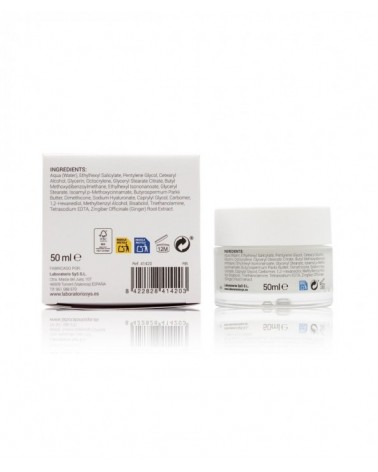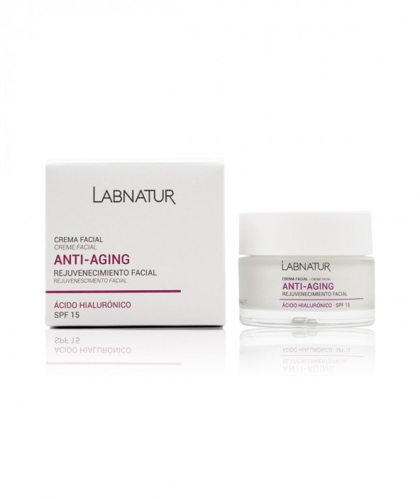 Crema anti edad facial de Labnatur. Proporciona a tu piel hidratación profunda y equilibra la pérdida de humedad. Aporta firmeza, luminosidad y textura. Lucirás una piel más joven y sana que nunca. Ideal para piel sensible, mixta y/o madura. Reúne las propiedades de los principios activos del ácido hialurónico y protección solar SPF 15. El ácido hialurónico reduce visiblemente las arrugas, aumenta la elasticidad de la piel, estimula la producción de colágeno, previene y rellena las arrugas, reconstruye las fibras que sostienen los tejidos de la piel, y atrae y retiene el agua de la dermis. Producto natural y vegano. Sin alérgenos ni parabenos. Envase de vidrio 100% reciclable. Testado dermatológicamente.