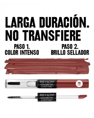 Nos más retoques. Labial líquido Color Stay OverTime LipColor de Revlon aporta color y brillo por hasta 16 horas de duración. No se transfiere y es a prueba de manchas. Aporta suavidad y confort. Deja un brillo sellador con vitamina E, manzanilla y extractos de soja, que mantiene los labios brillantes e hidratados.