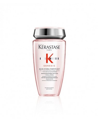 Kérastase Champú Bain Hydra-Fortifiant: Baño fortificante delicado para cabello de normal a graso debilitado con tendencia a la caída por rotura del cepillado. Beneficios del producto: "Sin siliconas. Elimina suavemente el sebo y las partículas de contaminación del cuero cabelludo y el cabello. Controla el exceso de grasa. Evita el riesgo de caída del cabello por rotura del cepillado. 97 % menos de caída del cabello por rotura del cepillado*.