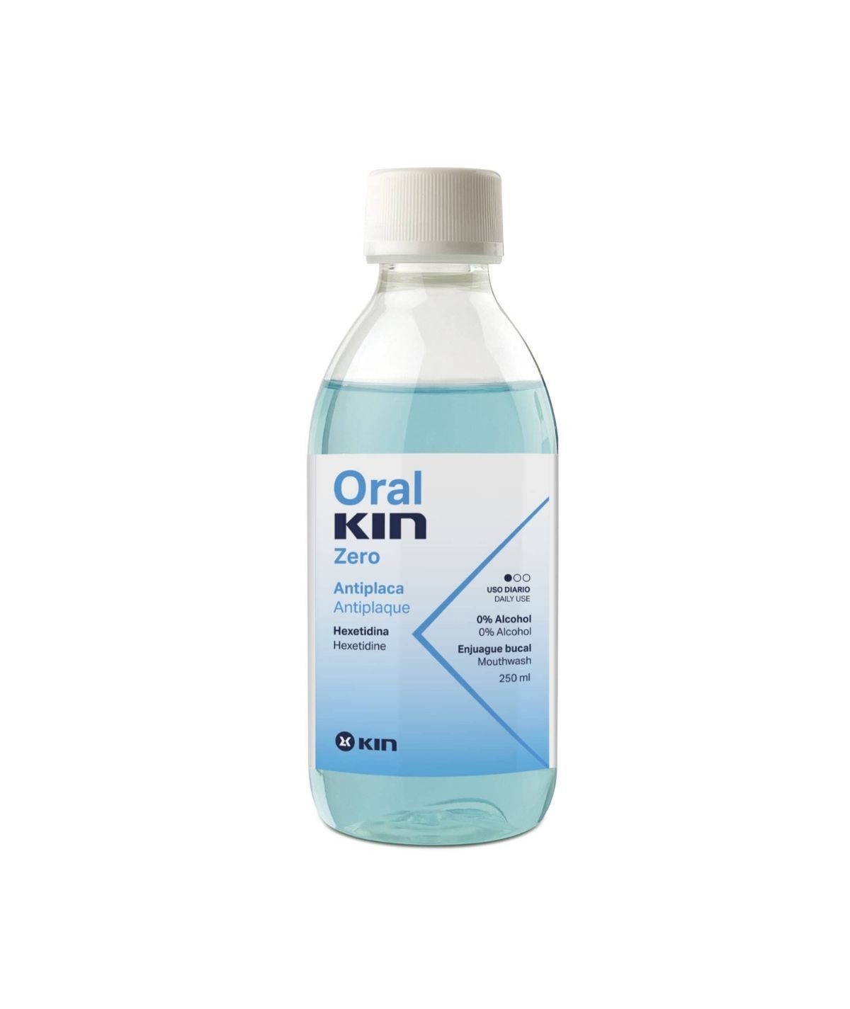 OralKIN Zero enjuague bucal, gracias a la combinación de sus principios activos hexetidina y flúor, aseguran una completa acción antiplaca. Su fórmula no contiene alcohol. MODO DE USO: Realizar 2 enjuagues diarios, tras el cepillado, mañana y noche, con 15 ml del producto sin diluir, durante 1 minuto. Es aconsejable no ingerir alimentos ni bebidas hasta transcurrido un mínimo de media hora después de su uso. ADVERTENCIAS: No ingerir. Mantener fuera del alcance de los niños. Sin gluten.