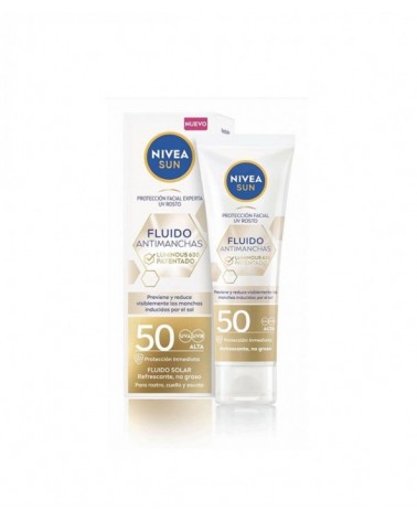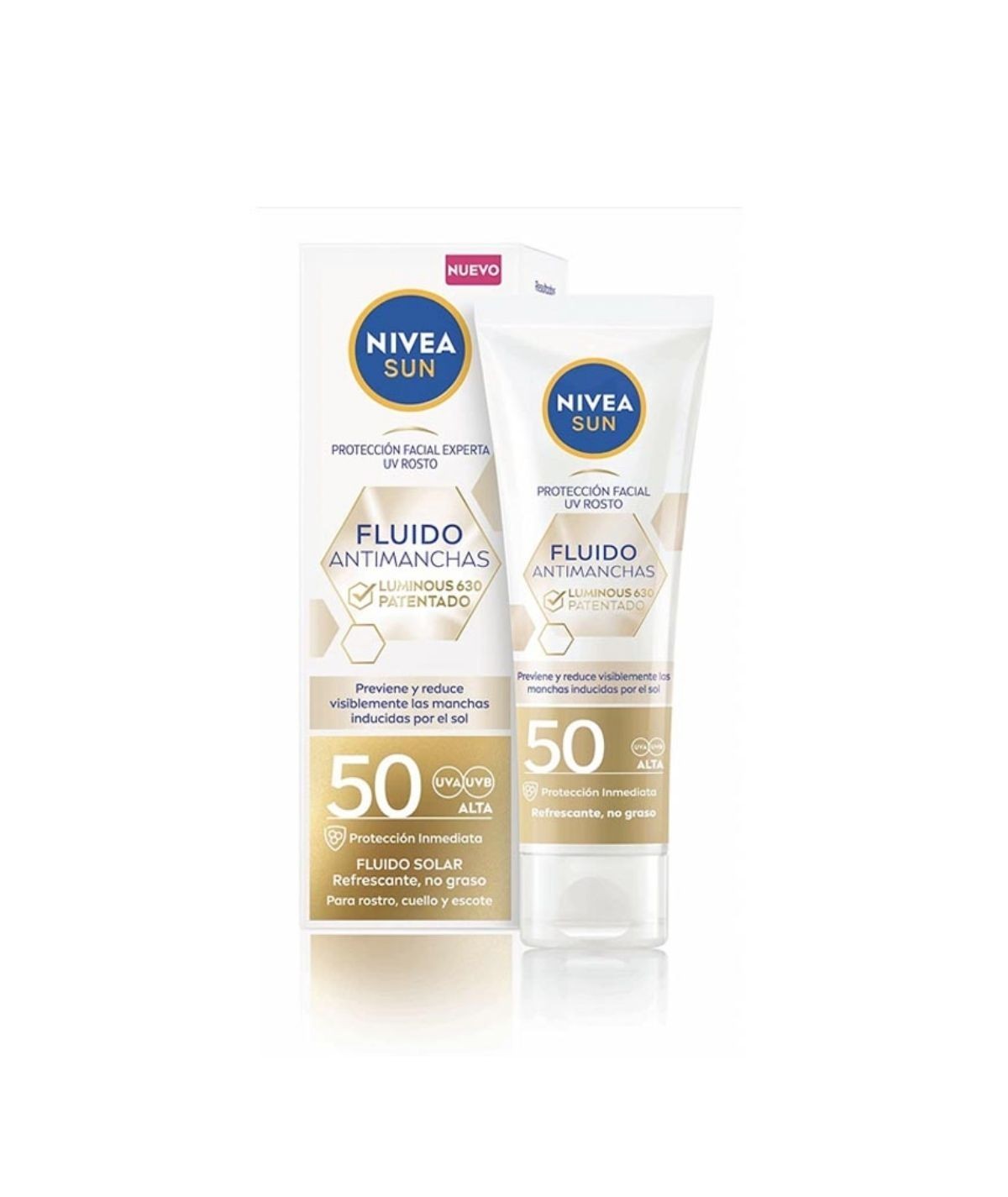 Nivea Sun Fluido Solar Anti-manchas para el rostro. Ofrece protección inmediata frente a los factores ambientales como los rayos UVA y UVB, y el envejecimiento prematuro de la piel. Contiene Luminous630, que previene y reduce de forma visible las manchas inducidas por el sol, aporta luminosidad y unifica el tono. No deja la piel grasa y es muy ligero. Deja sobre tu rostro un efecto refrescante y la piel hidratada y suave.