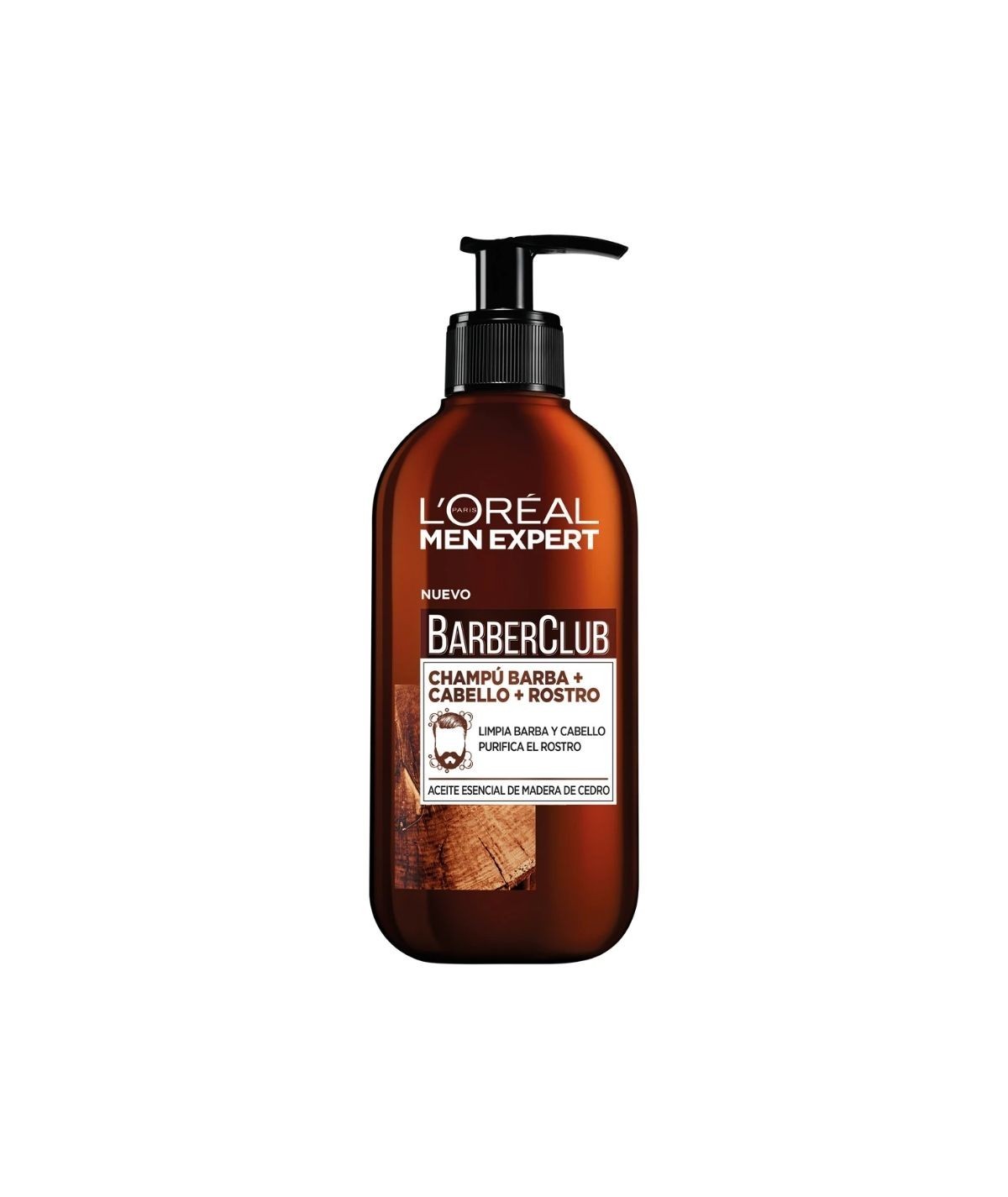 champú 3 en 1, para barba, cabello y rostro de la línea Barber Club. Con Aceite Esencial De Madera de Cedro.