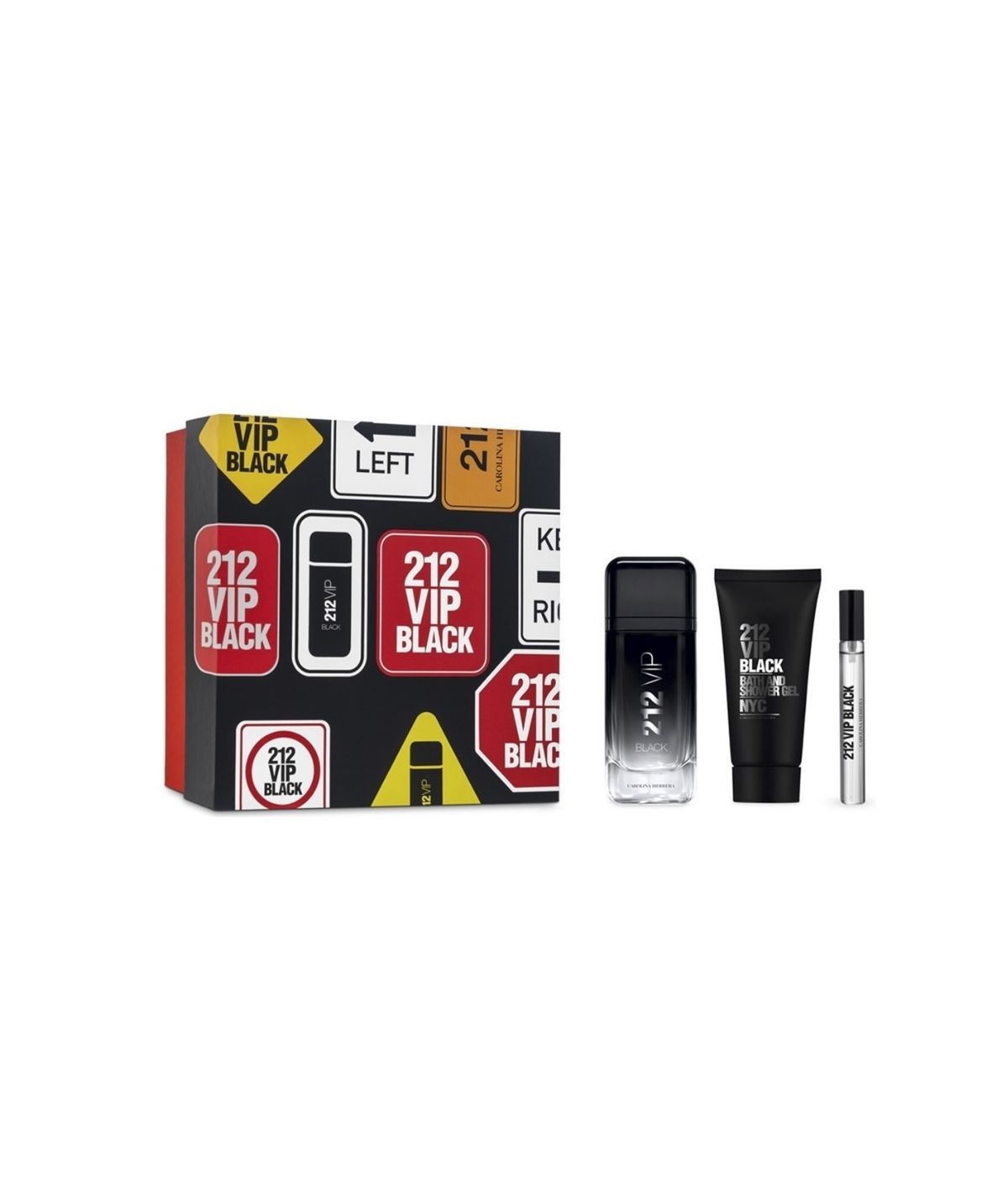 El estuche 212 VIP Black de Carolina Herrera contiene: 212 VIP Black Eau de Parfum 100 ml + Gel de Ducha 100 ml + Mini Vaporizador 10 ml.