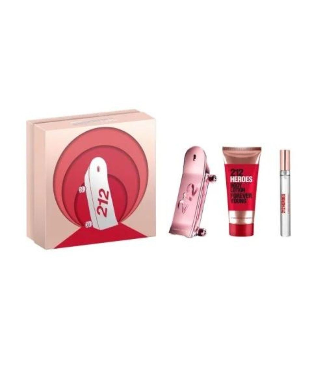 El perfume para mujer 212 Heroes For Her Eau de Parfum nace para celebrar la juventud sin límites, a partir de la reinterpretación femenina del icónico frasco con forma de skate de 212 Heroes, con un acabado en oro rosa. La nueva 212 Heroes For Her es una fragancia atrevida y efervescente. Formulada con ingredientes 100 % veganos, de origen sostenible y no testados en animales, este perfume se abre con una explosión de frutas cítricas que dan paso a una nota central de sensuales flores blancas y peonías. La adictiva base de sándalo y cedro añade profundidad, resultando en una fragancia que persiste durante horas sobre la piel. Este estuche contiene: - 212 Heroes Her Edp 80 ml - Body Lotion 100 ml - 212 Heroes Her Edp Roll-On 10 ml