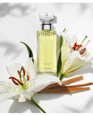 Inspirada en el romanticismo de hoy en día, Eternity for Women Eau de Toilette tiene notas superiores florales de lirio blanco y bergamota. Evoluciona a esencias de rosa blanca y violeta y se completa con notas secas y especiadas de madera de sándalo y ámbar dorado.