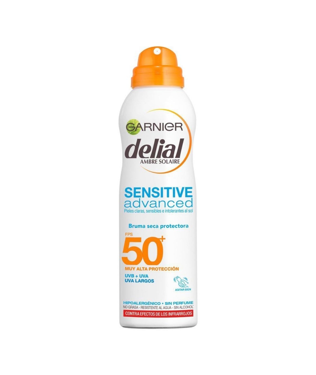 Spray seco con protección solar Spf50. Su fórmula resiste al agua y te protege frente a los rayos UVA y UVB. Su textura de bruma seca es ligera y de fácil aplicación, dejando tu piel desnuda. No deja manchas blancas.