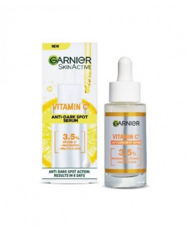 Garnier Serum Anti Manchas con Vitamina C, Niacinamida y Ácido salicílico. Reduce visiblemente las manchas oscuras y aporta luminosidad. Eficacia aprobada por laboratorios. Garnier Serum Anti Manchas con Vitamina C, Niacinamida y Ácido salicílico. Reduce visiblemente las manchas oscuras y aporta luminosidad. Eficacia aprobada por laboratorios: - Desde el 3 día, la piel está visiblemente más unificada y suave. - Tras 6 días, las manchas oscuras se reducen visiblemente. - Después de 56 días, -43% de contraste en manchas oscuras. **Test clínico en 74 personas, resultados medios en una marca de acné. Los resultados pueden variar.