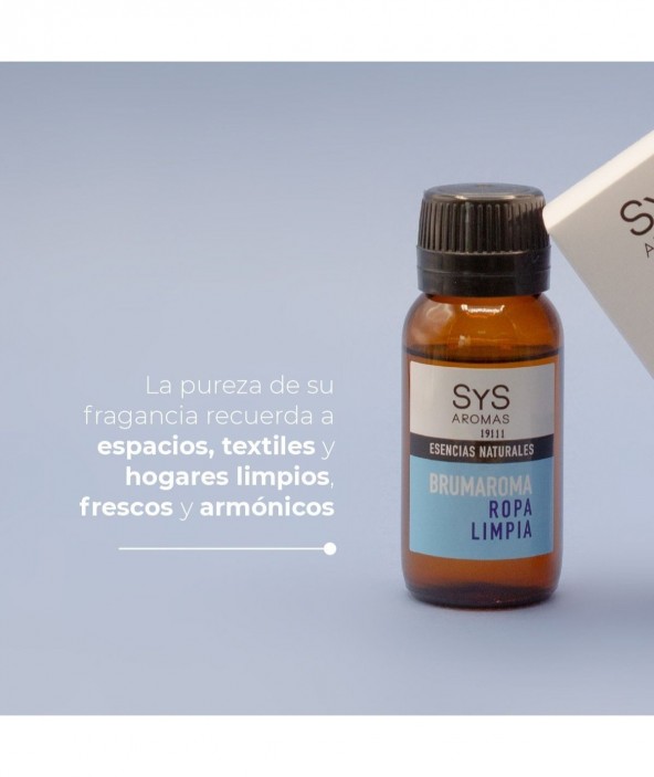 El Brumaroma SYS de Ropa Limpia destaca por sus notas florales, verdes, amaderadas y afrutadas. Un aroma que aporta frescura y perfume agradable para cualquier olfato. Este Brumaroma de SYS tiene 50ml y está altamente concentrado. Solo hay que añadir unas pocas gotas en agua de la cubeta de un humidificador o brumizador y difundirán su aroma por toda la estancia. Están especialmente creados para no estropear ni interferir en el buen funcionamiento de los humidificadores o Brumizadores, difusores de aroma que ayudan a mejorar el ambiente, al regular y aumentar la humedad. Los aceites y componentes de las esencias acaban por impregnarlos y estropearlos, pero el Brumaroma garantiza el correcto uso del Brumizador y sobre todo, que éste no se deteriore. Esta fragancia es muy amable y tiene la particularidad de que es del agrado de todo el mundo. Resulta muy fresca y familiar, huele a cosas sencillas, a limpio, a fresco, a ropa recién sacada de la lavadora, a hogar y aromas cotidianos que tenemos tan interiorizados y son tan esenciales en nuestra vida, que literalmente, nos hacen sentirnos cómodos y como en casa a través del olfato, por eso a la esencia de Ropa Limpia la llaman “el perfume de la felicidad”, porque olerla nos mete de lleno en nuestra propia vida confortable y cotidiana. En aromaterapia, el aroma a Ropa Limpia produce un efecto de bienestar inmediato, de pureza, limpieza, creando un ambiente sano y muy agradable. Provoca una sensación de relajación, aumenta la tranquilidad y la confianza, de felicidad absoluta. En cualquier espacio, este aroma familiar crea ambientes cotidianos y saludables que nos trasladan directamente a nuestra zona de confort. Una fragancia que da lugar a ambientes relajados, cómodos y con intimidad. Cualquier espacio sea el hogar o no, perfumado con este aroma, transmite la sensación de “sentirse como en casa”. Características: Notas florales, verdes, frescas y acuáticas y en segundo plano, notas afrutadas y aromáticas, con matices balsámicos y anisados. Su intensidad es de 3 puntos sobre 5. Si te gusta el aroma de Ropa Limpia, tienes más opciones para disfrutar de él. Puedes ponerlo en tu coche, en tus cajones y armarios, en la terraza, en la ducha, en tu bañera o en cualquiera de tus espacios favoritos. Descúbrelo aquí.