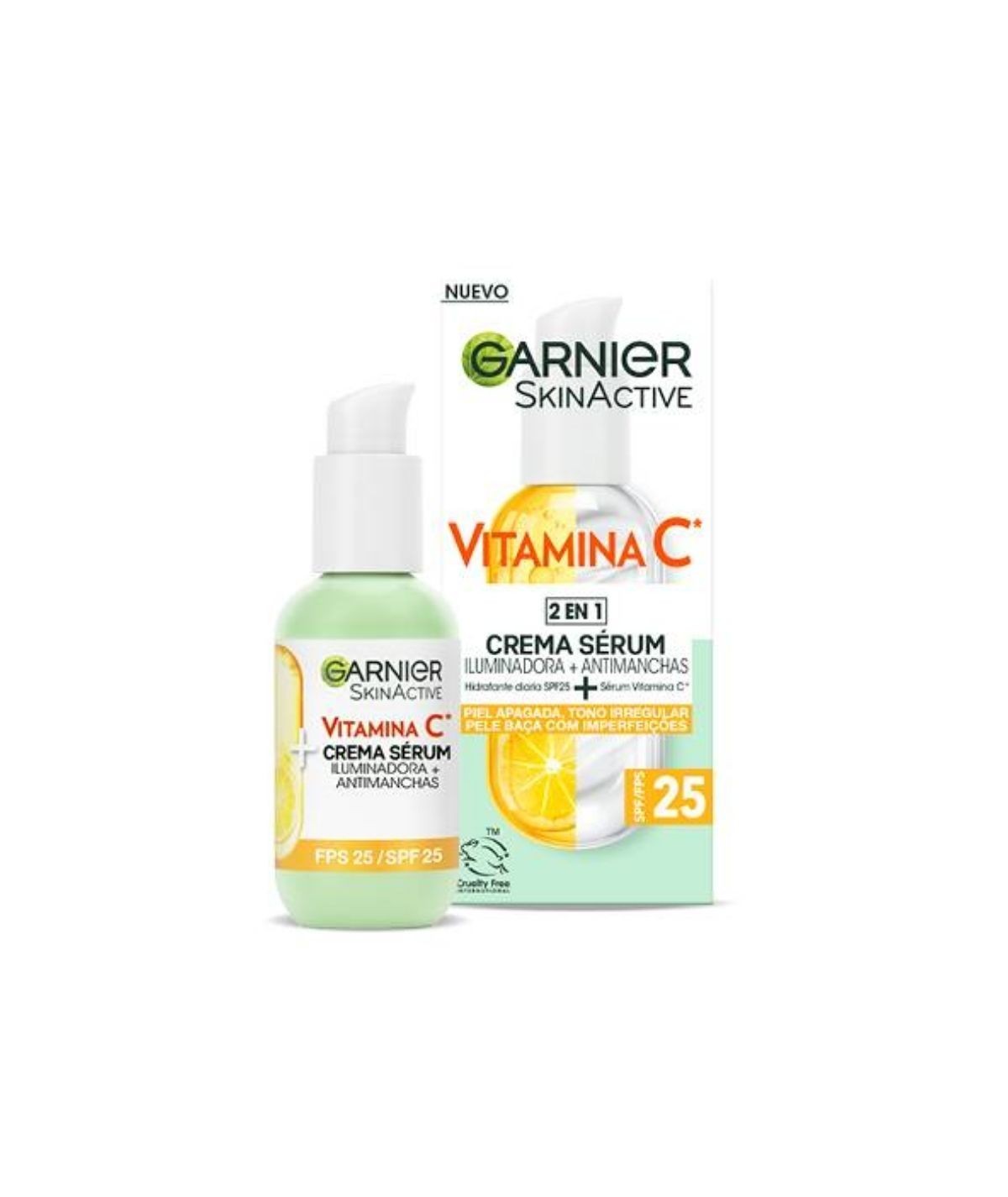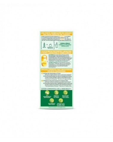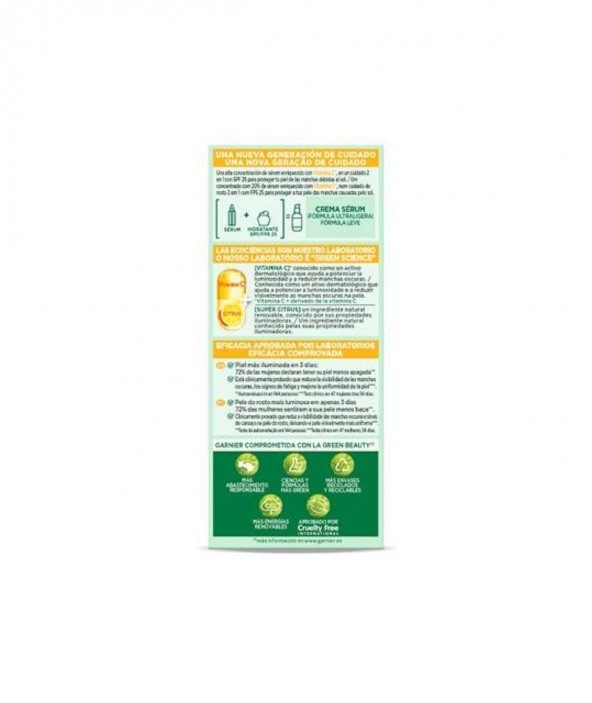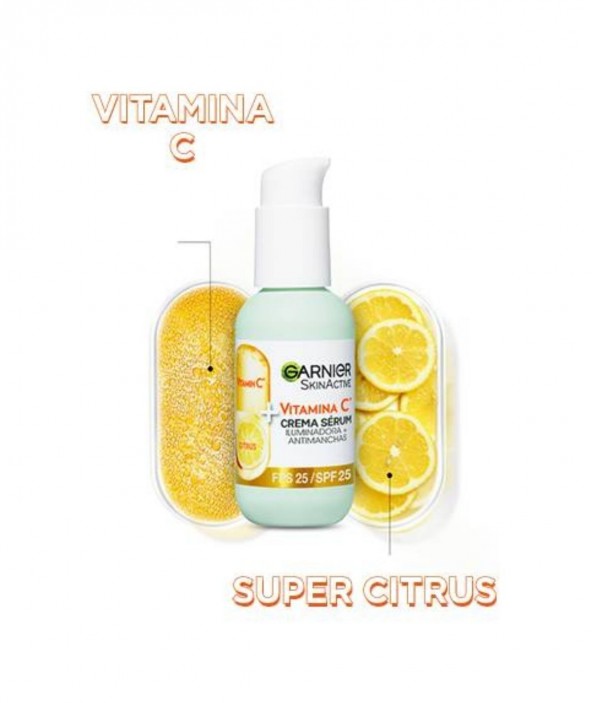 Garnier Crema Sérum con Vitamina C y SPF 25. Reduce la Visibilidad de las Manchas Oscuras, los Signos de Fatiga, Ilumina y Mejora la Uniformidad de la Piel. Garnier Crema Sérum con Vitamina C y SPF 25. Un Concentrado con un 20% de Sérum Enriquecido con Vitamina C que Reduce la Visibilidad de las Manchas Oscuras, los Signos de Fatiga, Ilumina y Mejora la Uniformidad de la Piel Clínicamente Probado. Una Fórmula Ultraligera que Actúa como Sérum y Crema Hidratante.El 72% declara tener la piel menos apagada*. Está clínicamente probado que reduce la visibilidad de las manchas oscuras, los signos de fatiga y mejora la uniformidad de la piel.** *Autoevaluación 144 personas/Test clínico en 47 mujeres tras 56 días.