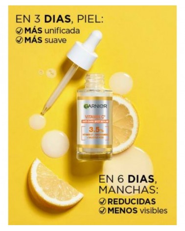 Garnier Serum Anti Manchas con Vitamina C, Niacinamida y Ácido salicílico. Reduce visiblemente las manchas oscuras y aporta luminosidad. Eficacia aprobada por laboratorios. Garnier Serum Anti Manchas con Vitamina C, Niacinamida y Ácido salicílico. Reduce visiblemente las manchas oscuras y aporta luminosidad. Eficacia aprobada por laboratorios: - Desde el 3 día, la piel está visiblemente más unificada y suave. - Tras 6 días, las manchas oscuras se reducen visiblemente. - Después de 56 días, -43% de contraste en manchas oscuras. **Test clínico en 74 personas, resultados medios en una marca de acné. Los resultados pueden variar.