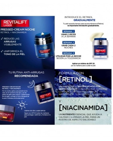 La crema de Descubre el nuevo duo anti/edad en un innovador Pressed-Cream. Retinol y Niacinamida, combinados con aceites nutritivos, en una crema de noche que hidrata intensamente la piel.noche perfecta. Su fórmula con retinol. L'Oréal Paris Pressed Cream Noche de Revitalift Laser con Retinol + Niacidamida.
