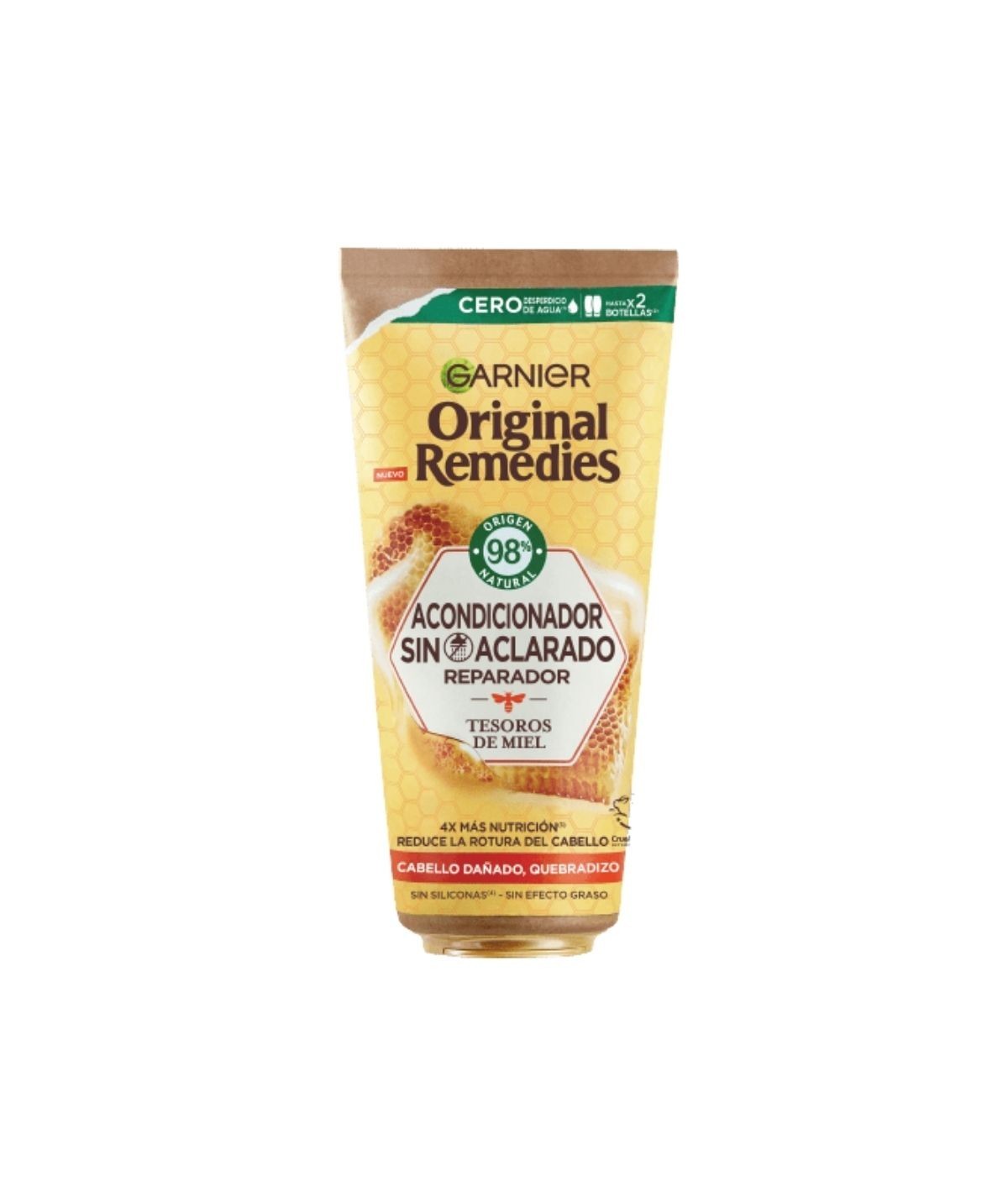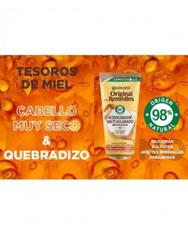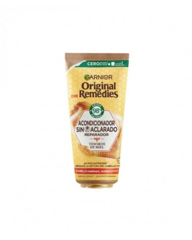 Especialmente diseñado para cabello dañado y quebradizo. Este acondicionador sin aclarado con miel de acacia y cera de abeja protectora 98% de origen natural fortalece el cabello, sella visiblemente las puntas abiertas y reduce la rotura del cabello. Su fórmula es ligera, de fácil absorción y no deja residuo. Consigue hasta 4 veces más nutrición sin desperdiciar agua y recupera el cabello dañado gracias al poder restaurador de la miel. Nuestro nuevo remedio reparador para reducir la rotura del cabello más dañado. Tu cabello queda 4x veces más nutrido, sin efecto graso y fácil de desenredar de raíz a puntas. Este nuevo Acondicionador sin Aclarado está hecho con miel de fuentes sostenibles, cera de abeja y aceite vegetal, sin siliconas. ¡Pásate al nuevo gesto sostenible de Original Remedies! 1· Cero desperdicio de agua: fórmula sin aclarado para ahorrar 100 L de agua caliente por producto. 2· Menos consumo de plástico: -75% menos plástico con nuestro tubo hecho de cartón. 3·Poca cantidad, mismo resultado: dura hasta 2 botellas de un acondicionador tradicional. 4. Comprometido con el planeta: -92% menos huella de carbono.