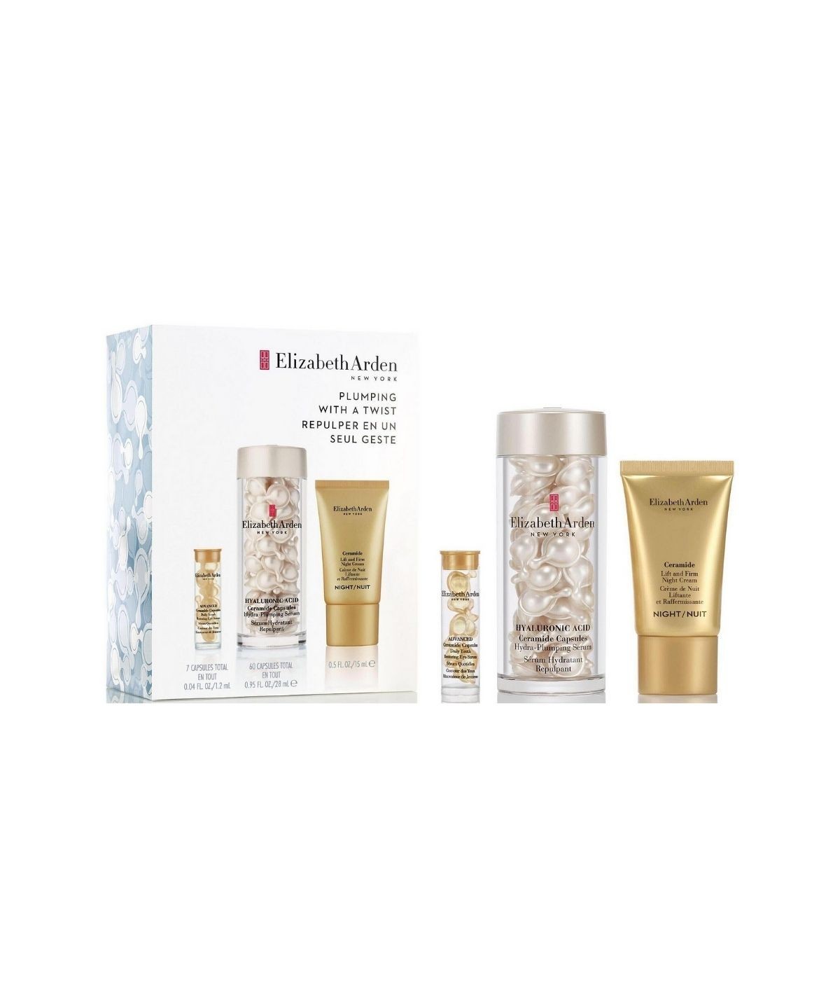 kit incluye: Hyaluronic Acid Ceramide Capsules Hydra-Plumping Serum 60pcs + Advanced Ceramide Capsules Daily Youth Restoring Eye Serum 7pcs + Ceramide Lift and Firm Night Cream 15ml