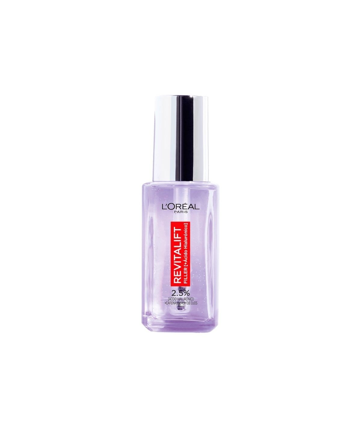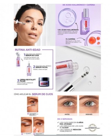 Rellena patas de gallo y corrige ojeras. Aplicador triple roll-on efecto frío. Contorno de ojos antiarrugas probado por dermatólogos. Serum con ácido hialurónico Revitalift Filler que hidrata intensamente y rellena las líneas alrededor de los ojos, y cafeína que revitaliza la piel para reducir ojeras y bolsas. Efecto refrescante instantáneo gracias a su aplicador flexible en formato roll-on con 3 bolas de acero inoxidable, que ayudan a desinflar las ojeras y se adapta al contorno de los ojos. Contorno de ojos antiarrugas que proporciona una mirada 5 años más joven en 2 semanas* Aprobado por dermatólogos** *Equivalencia en años de mejora de la apariencia de las patas de gallo y líneas bajo los ojos. Estudio clínico en 81 mujeres tras 2 semanas de uso. ** Sérum ojos aprobado por los dermatólogos del comité asesor de L'Oréal Paris
